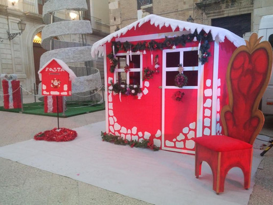 Postazioni: area selfie con SLITTA DI BABBO NATALE e POSTER GIGANTE DI UN PAESAGGIO INNEVATO, CASETTA DI BABBO NATALE in legno, CASSETTA POSTA PER LETTERINE, TEATRO DI NATALE allestito a tema